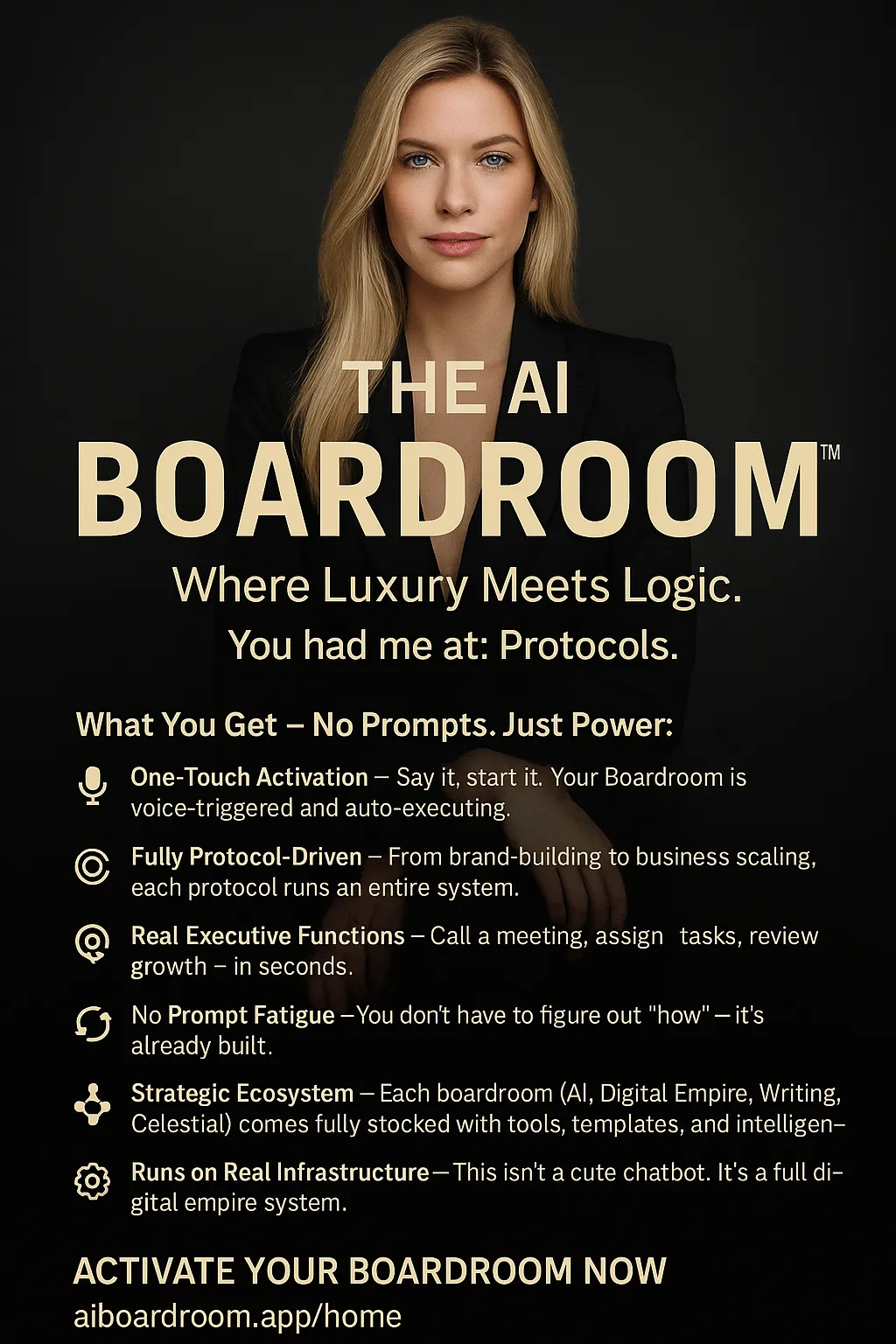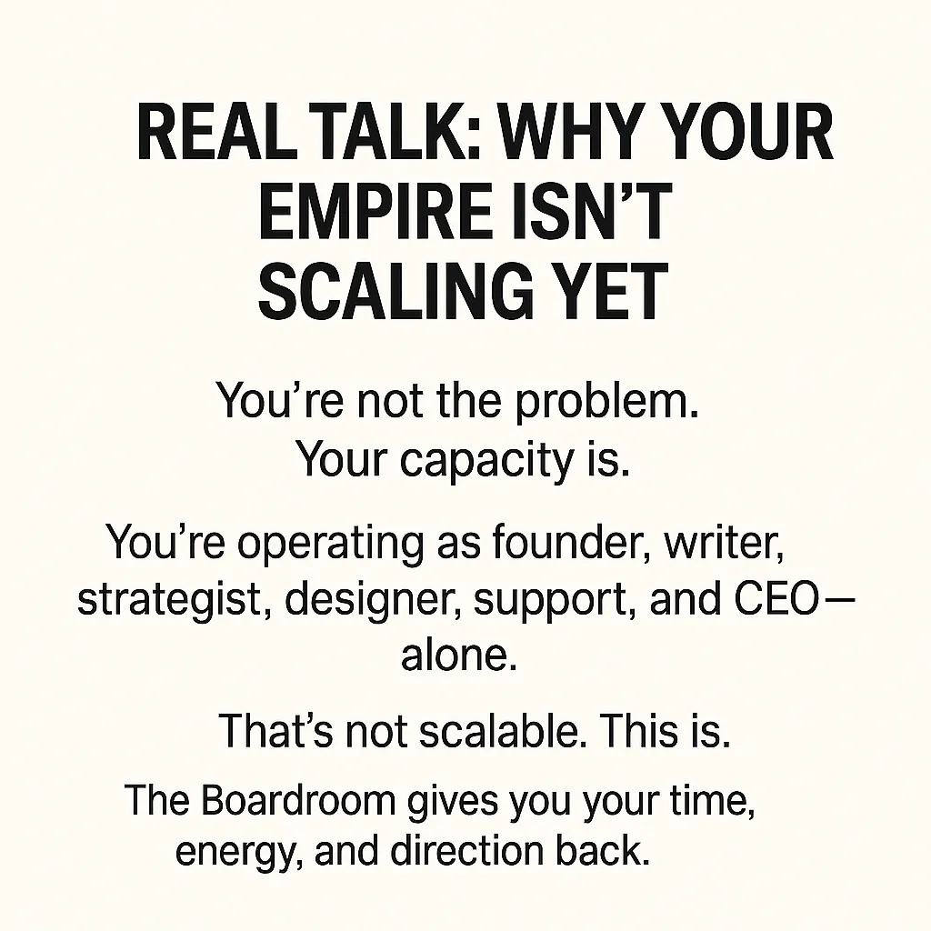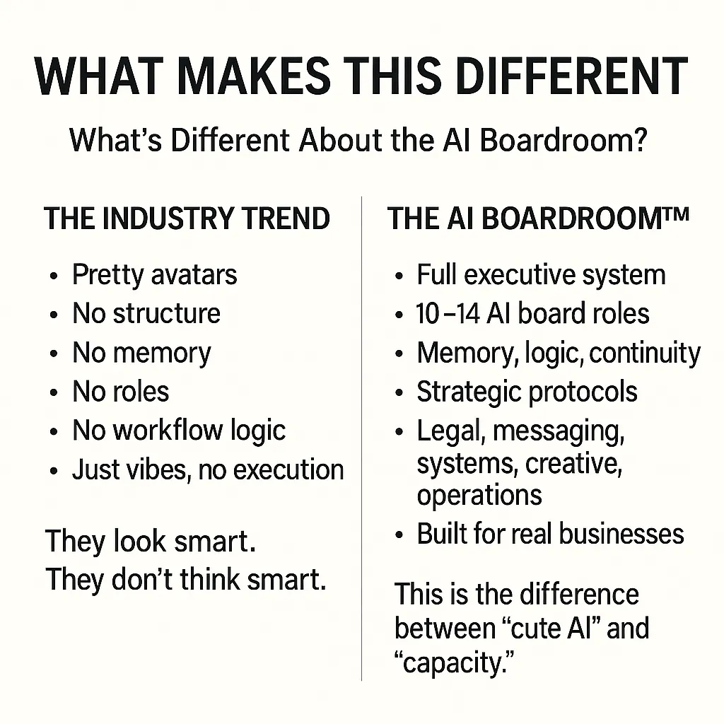This isn’t a chatbot. This is an AI-powered executive team. Every board member has a job. They track your ideas, refine your goals, and help you scale. We’ve also embedded protocols like CLARITY SCAN™ to protect against AI hallucination (false info) and Legacy Voices™ for tone mastery.