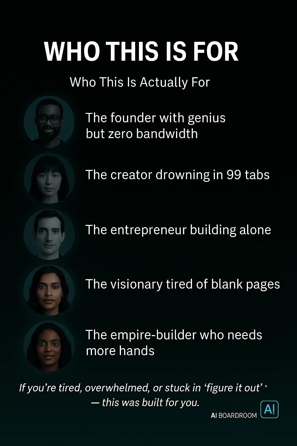 The AI Boardroom™ was built to support clarity at every level — whether you’re an individual making decisions, an entrepreneur growing a brand, or a team leader managing a full-scale operation. You can: