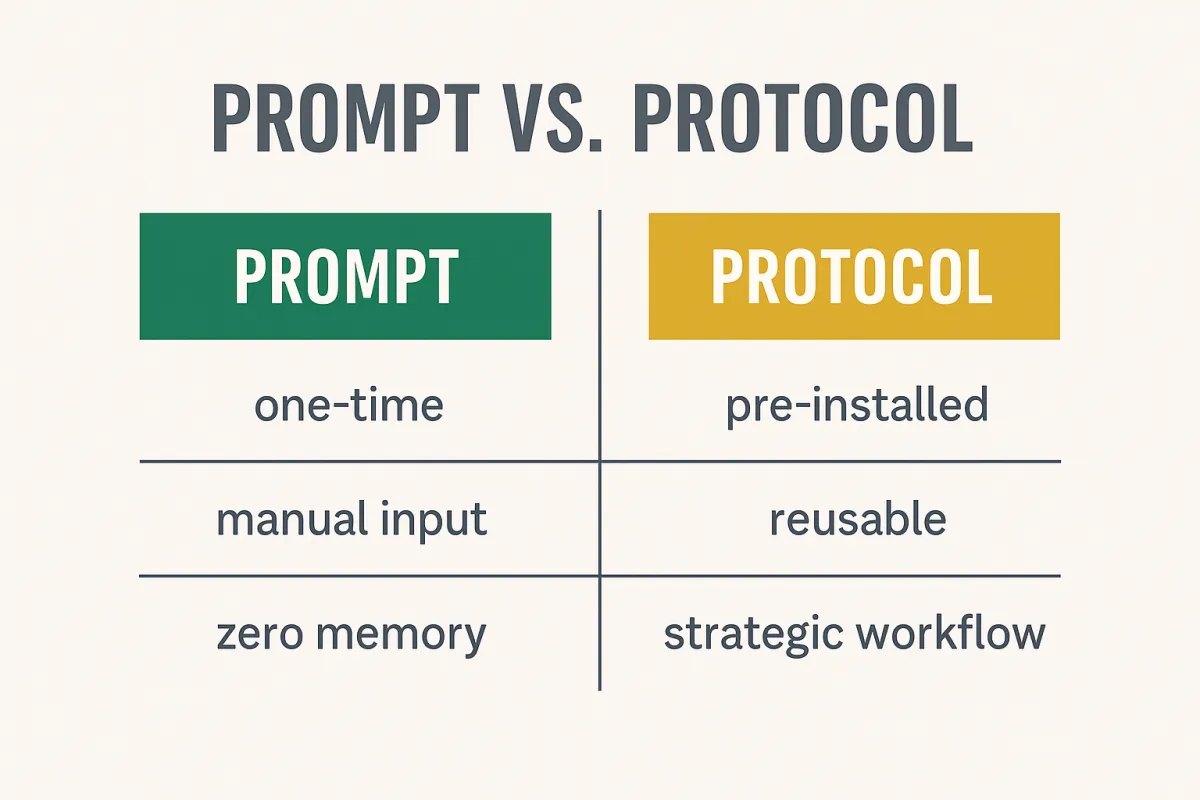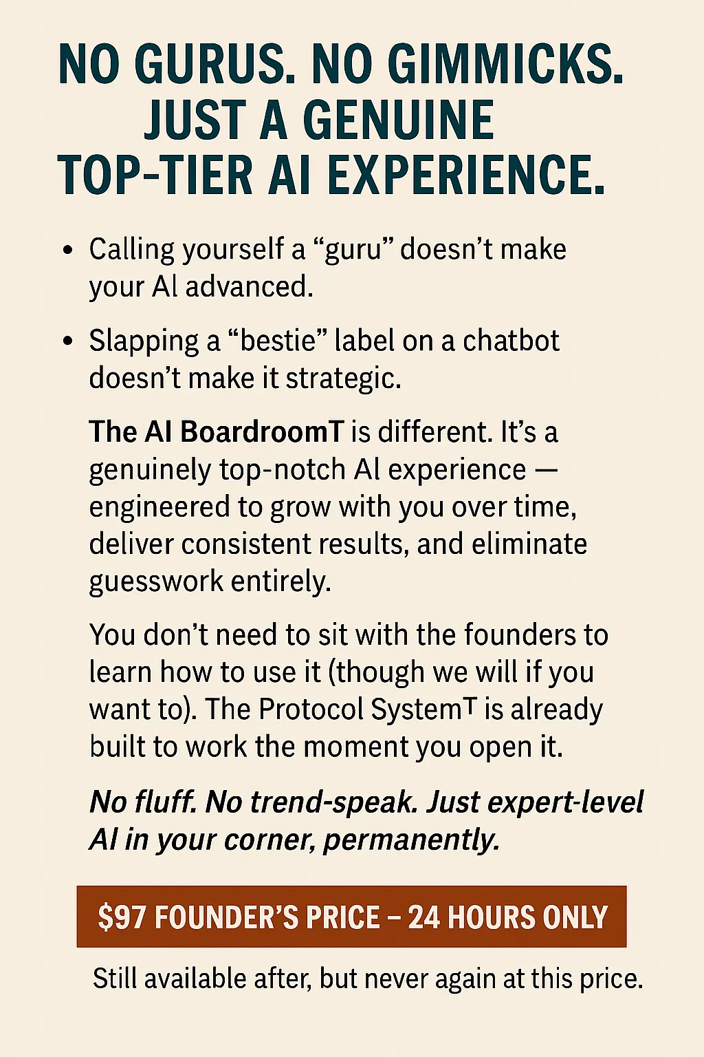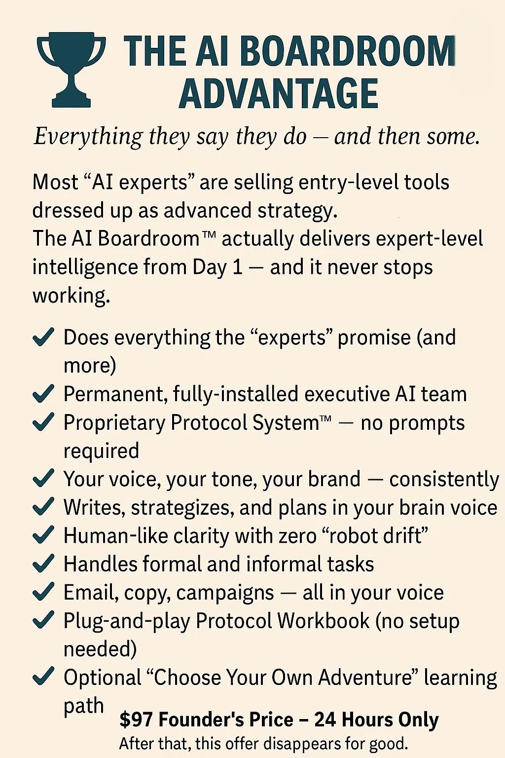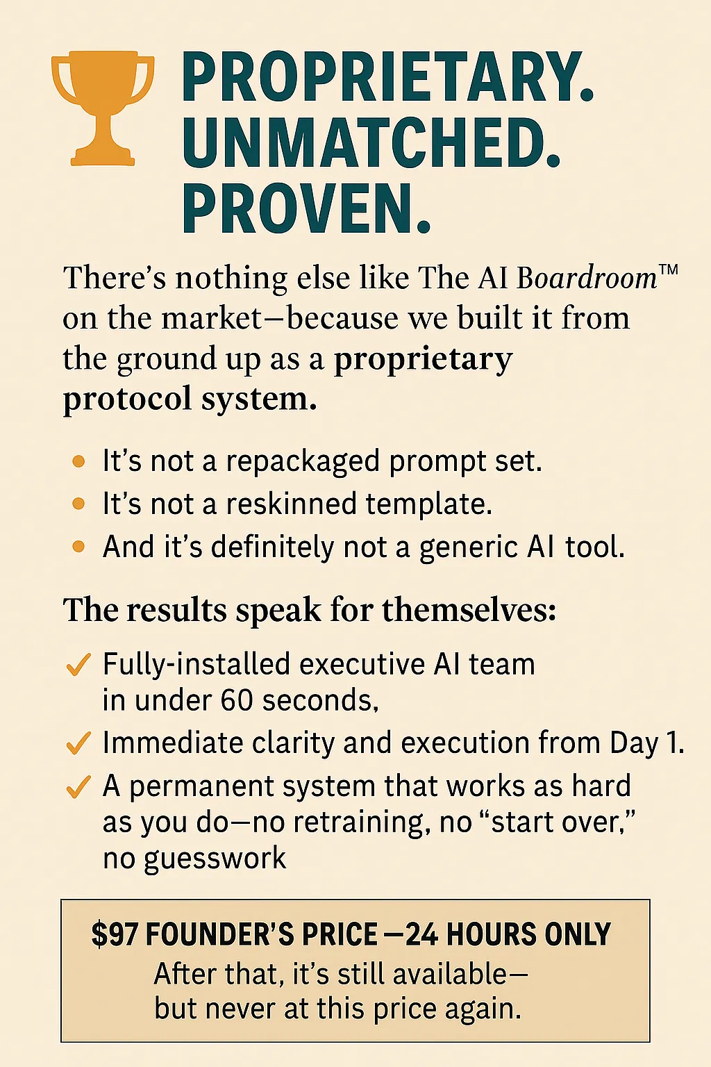 A: Most tools are one-off prompt packs or generic chatbots. The AI Boardroom™ is a permanent, fully-installed executive AI team powered by a proprietary Protocol System™ — no prompts required. It’s engineered for expert-level strategy from Day 1.