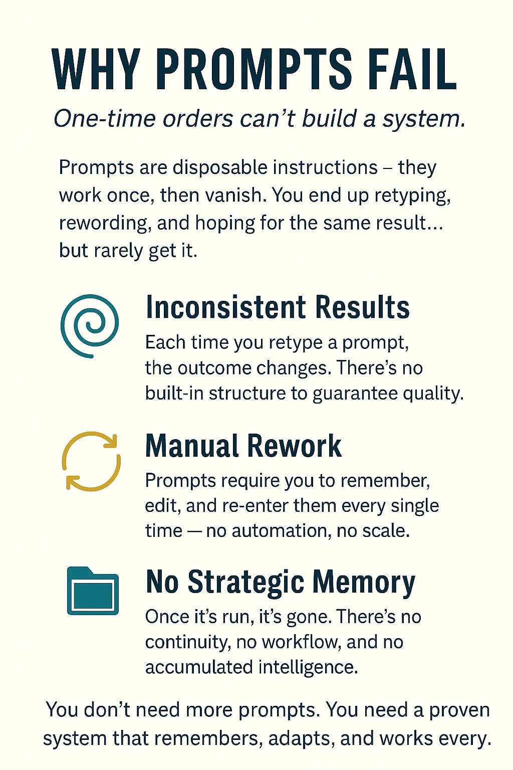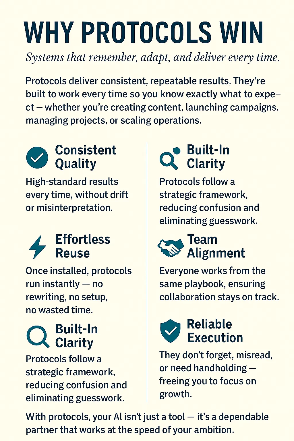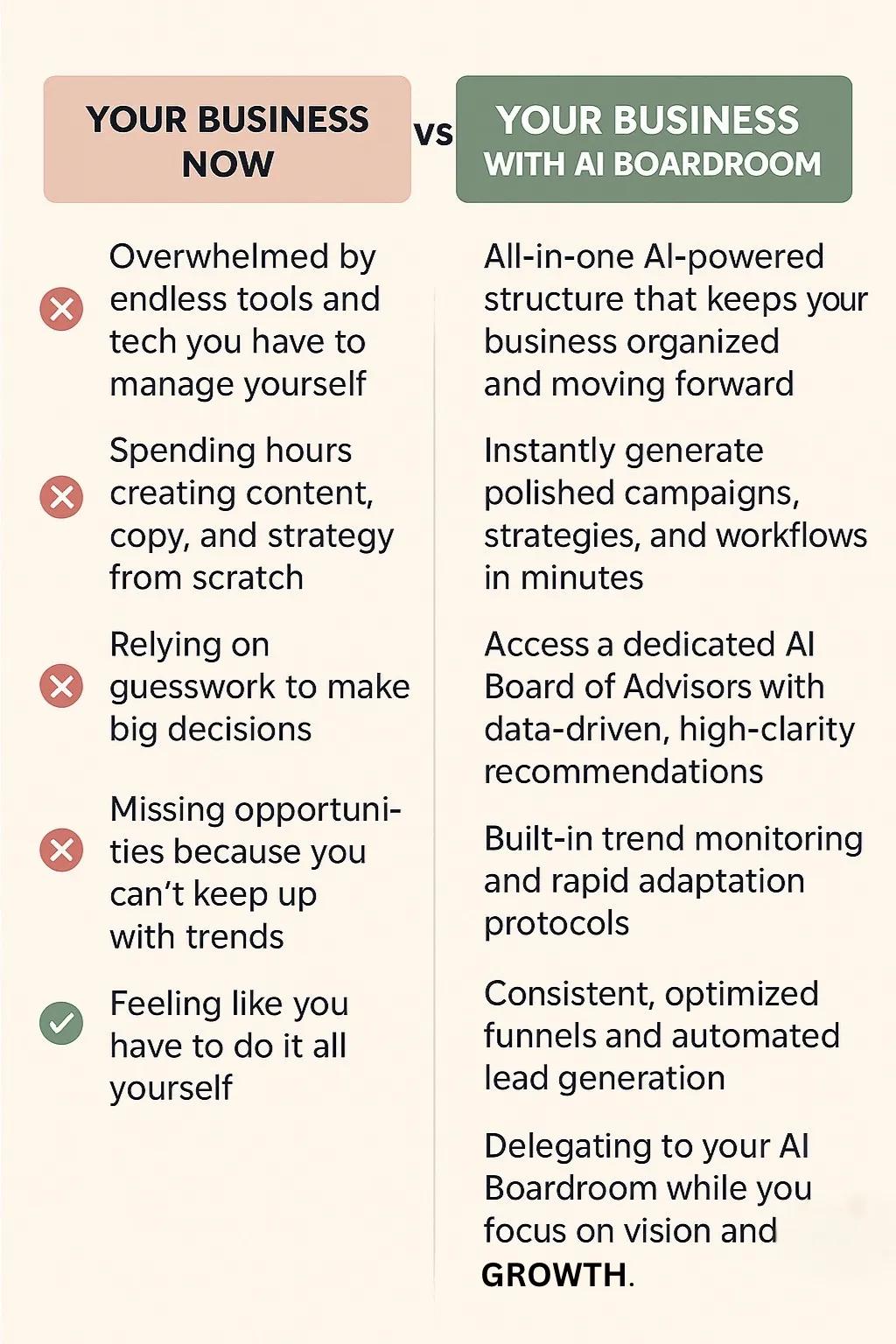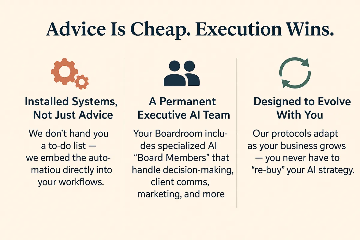 A: Most tools are one-off prompt packs or generic chatbots. The AI Boardroom™ is a permanent, fully-installed executive AI team powered by a proprietary Protocol System™ — no prompts required. It’s engineered for expert-level strategy from Day 1.